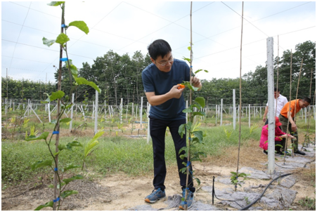 18号上午,公司领导和参与此次活动的职工从出版社出发,经过2个小时车程到达了郭石村百香果种植基地。该种植基地由我社投资建设,是我社产业扶贫的重要内容。此次百香果园之行的目的是修剪植株徒长的新芽,使植株果实能更好地吸收营养,茁壮成长。一望无际的百香果园让在场的人赞叹不已,虽然烈日炎炎,但是大家的热情丝毫不减。在驻村书记和驻村工作人员的悉心指导下,大家很快便掌握了要领,有条不紊地行动起来。经过2个多小时的劳作,百香果园的修剪工作顺利结束。虽然汗流浃背,但大家脸上都洋溢着喜悦的笑容,不仅是因为在劳作的过程中掌握了相关农业知识,更是为自己给郭石村的百香果种植事业做出贡献而感到欣慰。大家都期待着百香果园早日结出丰硕果实。