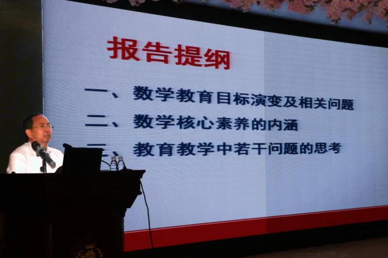 会议开始,由海南省教育研究培训院孙孝武老师作题为《明确育人目标,实施数学教学》专题报告。孙孝武老师从数学教育目标演变及相关问题、数学核心素养的内涵和教育教学中若干问题的思考三个方面分享了他的独特见解和宝贵经验。