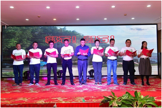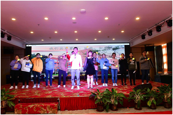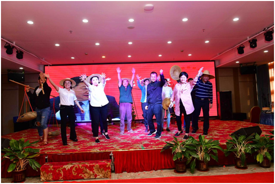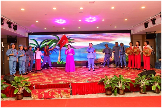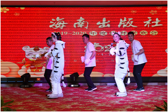 下午3点半,公司团拜联欢会拉开帷幕。除在职员工外,公司退休员工30余人及公司定点扶贫村郭石村代表8人应邀参加了团拜会。高管团队以一部形式新颖的配音短剧《平凡之路》点燃了全场的激情。随后,各部门精心准备的13个节目先后亮相,为团拜联欢会增添了喜庆祥和的气氛。由编校设计中心带来的配音情景剧《出版新“声”》,讲述了编校员工从试用期的新生成长为业务老手的故事。由重点项目分社、电子音像社、养生保健分社和教育网络公司共同演绎的情景剧《诵国学溯文脉 忆东坡》,讲述了千百年来从徼外荒服到海滨邹鲁,从文化沙漠到书香胜地,海南文化发生了翻天覆地的变化。最后,驻村第一书记满丽华带领郭石村村民代表上台合诵《郭石!郭石!》,为团拜联欢会节目演出画上了一个完美的句号。