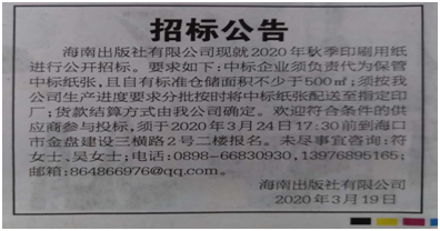 3月19日,按照招标程序,公司在《海南日报》上刊登了印刷用纸招标公告。